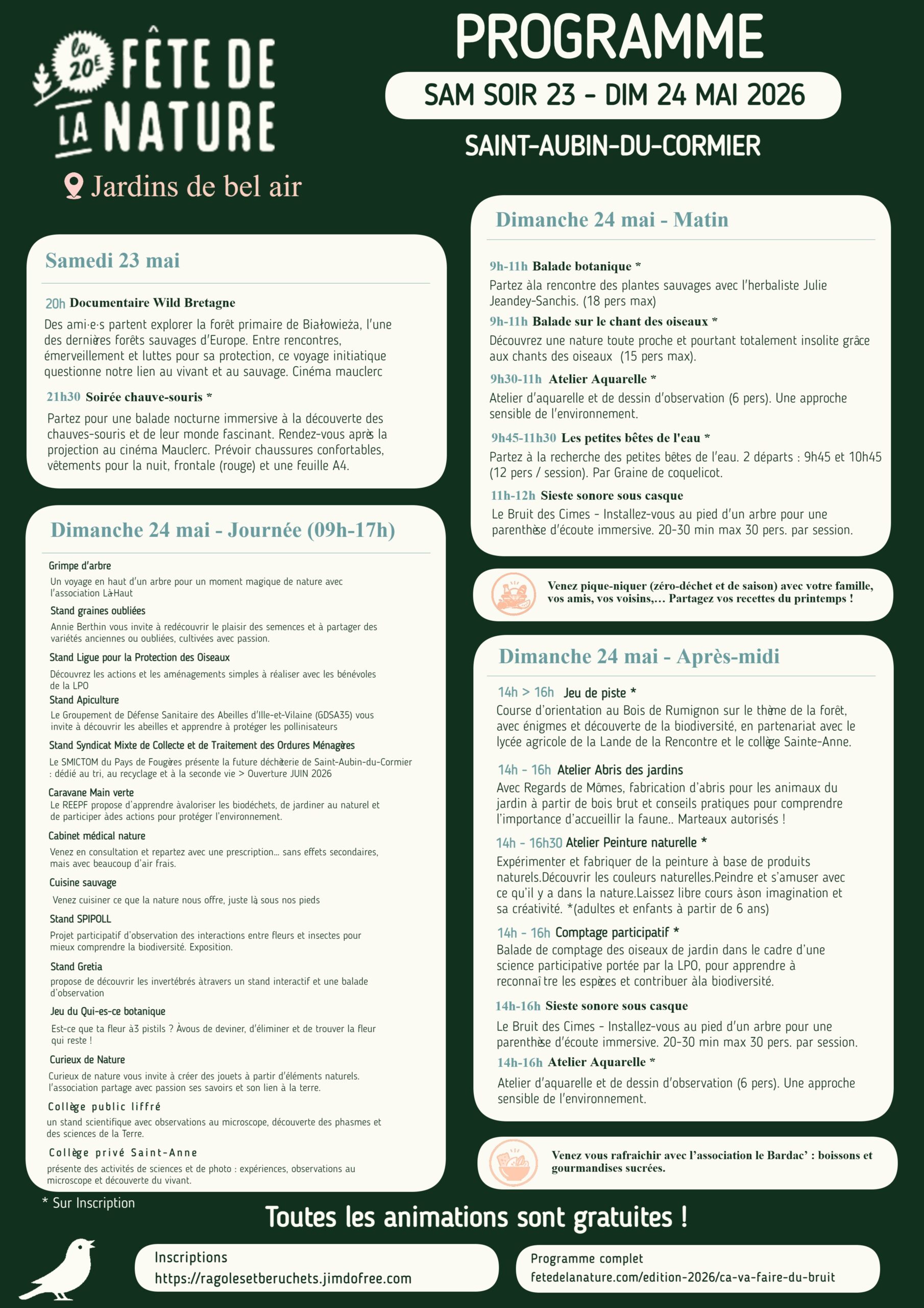 Venez 𝒄𝒆́𝒍𝒆́𝒃𝒓𝒆𝒓 𝒍𝒂 𝒏𝒂𝒕𝒖𝒓𝒆 𝒔𝒐𝒖𝒔 𝒕𝒐𝒖𝒕𝒆𝒔 𝒔𝒆𝒔 𝒇𝒐𝒓𝒎𝒆𝒔 à l’occasion de la Fête de la Nature à Saint-Aubin-du-Cormier ! Cuisine sauvage, ateliers en plein air, jeu de piste, rencontres avec des passionnés, animations pour petits et grands…